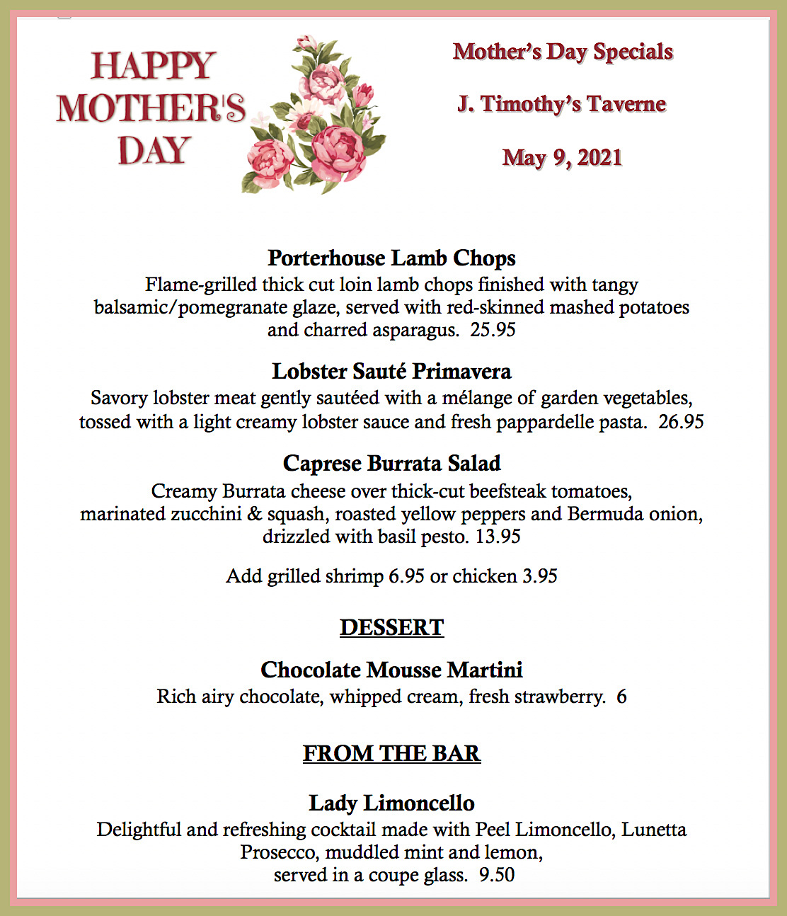 Tickets are 3995 for adults children 10 and under are 1995 and Bottomless Mimosas are 15. Mothers Day is coming up on Sunday May 9 2021. This Mothers Day treat mom to a delicious homemade family style meal let us take care of all the cooking.